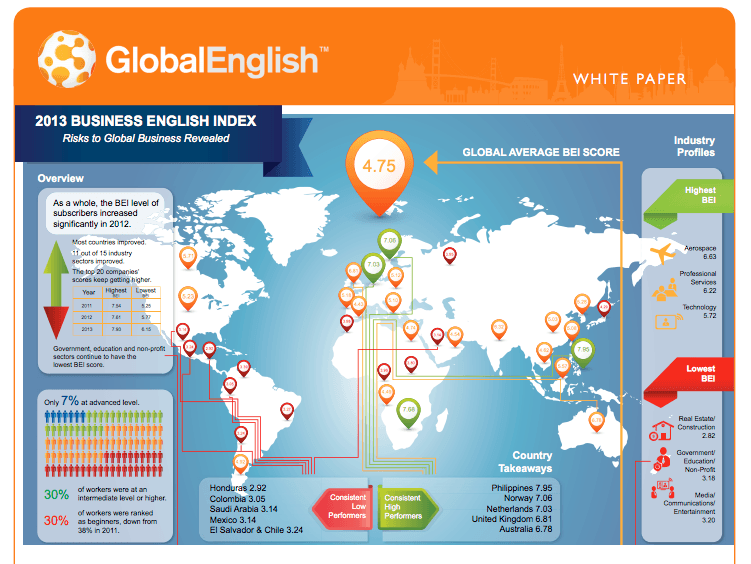 少し古いのですが2013年にピアソン・エデュケーショングループのGlobalEnglish(現在はPearson Englishという名前)が非ネイティブな英会話者を対象にビジネス英語力の世界ランキングを発表しました。